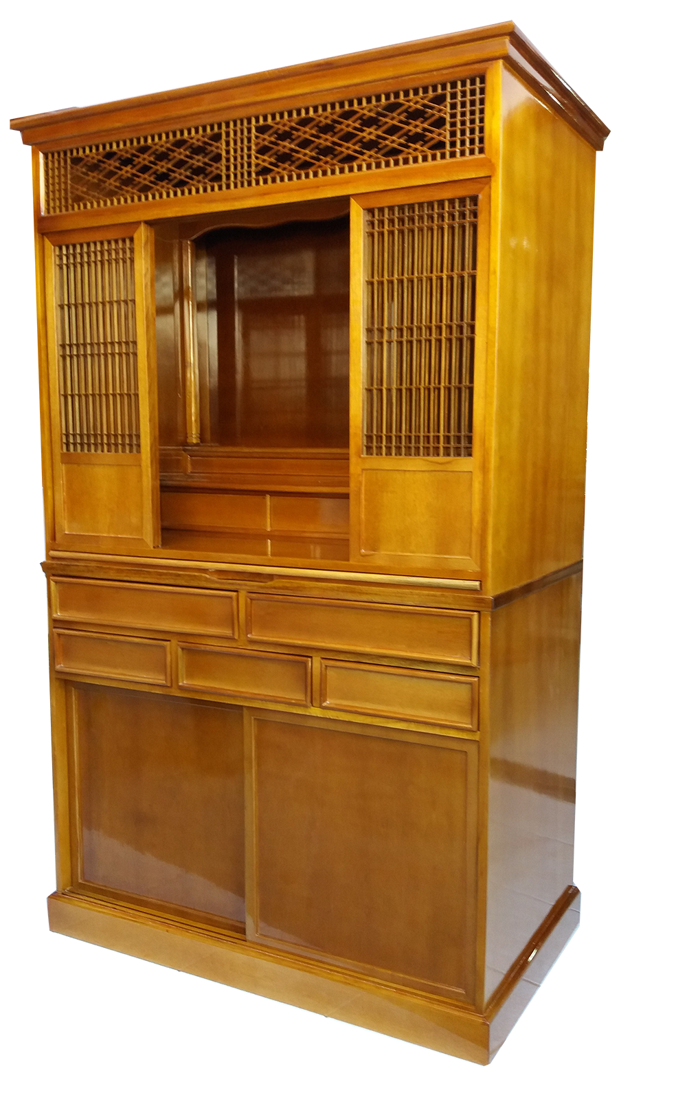 Descrição: Oratório modelo B.OK-05 COMPLETO - nas medidas de 180 altura x 110 largura x 64 profundidade com três andares (02 degraus) contendo quatro portas de correr trabalhadas com shoji quadriculado. Base expansiva p/ acessórios com cinco gavetas. Fundo do oratório em dourado.